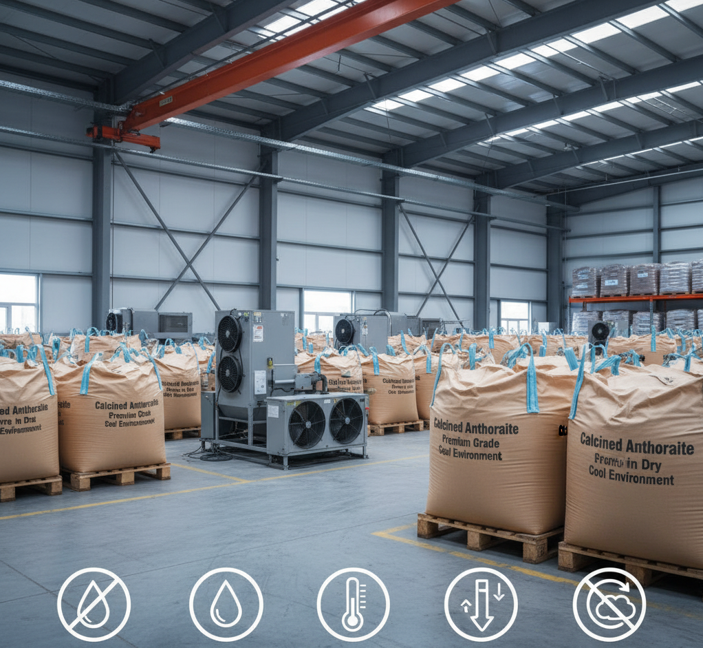آنتراسیت کلسینه باید در محیطی خشک و خنک نگهداری شود. رطوبت زیاد می ‌تواند باعث جذب آب توسط ذرات زغال سنگ شده و منجر به کاهش کیفیت، راندمان سوخت و حتی ایجاد مشکلات در فرآیندهای گرمایشی و صنعتی شود. دمای مناسب و تهویه کافی نیز به حفظ خواص فیزیکی و جلوگیری از دگرگونی ‌های ناخواسته کمک می ‌کند.