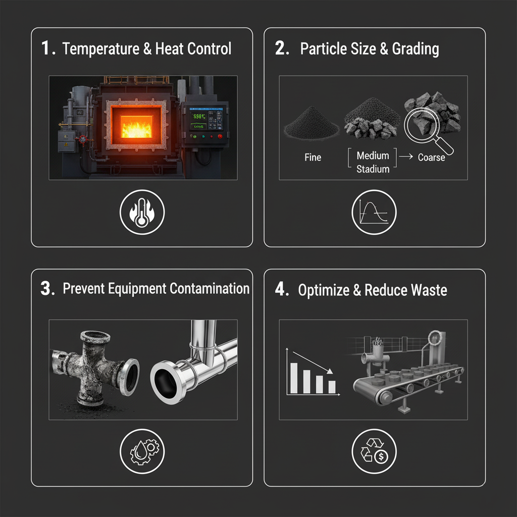 آنتراسیت کلسینه در دماهای بالا بهترین عملکرد خود را نشان می ‌دهد، و استفاده از آن در دماهای پایین یا ناپایدار می ‌تواند باعث کاهش راندمان سوخت و تولید دود یا خاکستر اضافی شود. تنظیم دقیق دما و استفاده از ابزارهای کنترل حرارت، نقش مهمی در بهره ‌وری و حفظ کیفیت محصول داشته و فرآیندهای صنعتی را روان و بدون توقف نگه می‌ دارد.